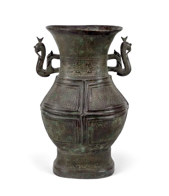 A LARGE CHINESE BRONZE BALUSTER VASE IN THE ARCHAIC STYLE SONG-MING DYNASTY Twin dragon handles flanking body with relief banding, with bronze scripts to inside up top rim 56.5cm high, 39cm wide Condition Report: the rim restored with plasterthe foot cracked and restoredsurface with wear and patina commensurate with age Condition Report Disclaimer