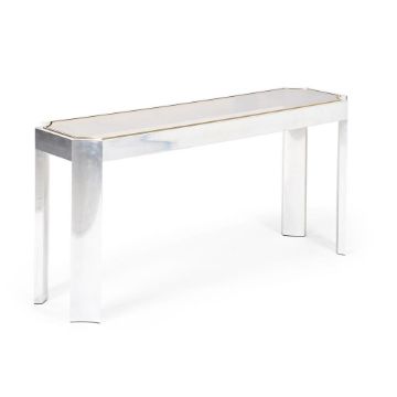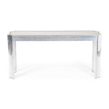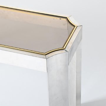 IN THE MANNER OF WILLY RIZZO A SLIM CONSOLE TABLE; LATE 20TH CENTURY Polished steel, inset tinted glass top. 63.5cm high, 132cm wide, 35.5cm deep