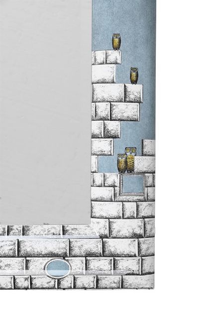 ATTRIBUTED TO FORNASETTI LARGE OVERMANTEL MIRROR; SECOND HALF 20TH CENTURY Bevelled edge mirror glass, rectangular convex gloss frame, decorated with bricks and perching owls. 101.5cm x 70cm Simple brick structures (architectural themes) and owls are strong and constantly revisited themes of Piero Fornasetti's designs.