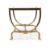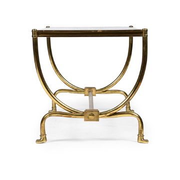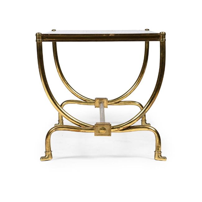 JACQUES QUINET (FRENCH, 1918-1992) 'BERCEAU' COFFEE TABLE; DESIGNED/MADE 1952 Gilt bronze and glass 45.5cm high, 110cm long, 49cm wideProvenance: The table's first owners, were cousins of the French painter Jean René Bazaine (1904-2001), who acquired it directly from Quinet for their apartment in Paris, 1952. Christies Paris, 'DESIGN VENTE DU SOIR', 22 Nov 2016, lot 120 Literature: Guitemie Maldonado, Jacques Quinet; Les Editions de l'Amateur, Paris, 2000, p. 43 - 46 for the same model that belonged to Jacques QuinetFrench designer Jacques Quinet (1918-1992) was renowned for his minimalist yet refined approach to furniture design, which balanced functionality with elegance. The 'Berceau' coffee table, patinated in bronze and glass showcases his penchant for understated luxury. The works sweeping bronze legs evoke a sense of both grace and strength, resembling an elegant cradle- the translation of the French word 'berceau'. The juxtaposition of these smooth, curved metal lines with the transparent glass top, underscores Quinet's skill in blending modernist sensibilities with classical aesthetics.Born in 1918, Quinet grew up in France where he was shaped by both the pre-war art movements and the profound transformations that followed World War II. He was a private individual, more focused on his craft than seeking the limelight. His background in fine arts and early exposure to the world of furniture-making shaped his design philosophy. He studied at the prestigious École Boulle in Paris which gave him a foundation in both traditional craftsmanship and contemporary design. He often designed several bespoke pieces for upscale Parisian apartments and high-profile clients. Despite his understated personal demeanour, Quinet's work became emblematic of mid-century French sophistication.The mid-20th century saw a revival of a neoclassical style, mostly due to the artistic austerity and functionalism of earlier modernist movements such as Bauhaus. Earlier movements had focused on strict minimalism and industrial materials. Designers after World War II looked to bring back luxury and tradition to furniture design without completely abandoning more modernist values. This table exemplifies the combination in his use of patinated bronze and graceful curvature which harks back to classical forms, echoing the influence of ancient Greco-Roman design. He refrains, however, from over-ornamentation and it is this simplified interpretation of neo-classical principles that gives his designs a timeless quality.The longing for societal permanence and continuity after the upheaval of the war facilitated a demand for neoclassical design. Consumers desired interiors that not only projected stability but also an escape from the chaos. Quinet's emphasis on craftsmanship fulfilled this need by creating pieces that were both luxurious and practical, serving as subtle reminders of classical ideals of beauty and proportion without compromising on contemporary functionality.   Condition Report: Various minor signs of wear - marks, scuffs, scratches and dints in line with use and age. The patination to the metal frame is nicely aged/patched/tarnished. The glass is very clean with a wide bevel. There is a bend to one foot - in the design, this is slightly more pronounced on one side. The table present well and have obviously been looked after by the previous owner.Condition Report Disclaimer