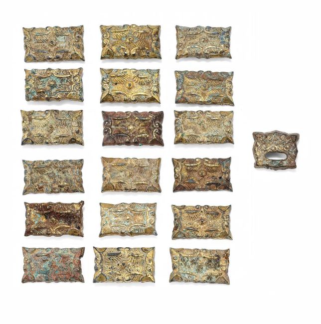 A set of Chinese gilt-bronze harness ornaments, Liao Dynasty (907-1125), comprising: eighteen rectangular plaques and one buckle, each rectangular plaque cast in openwork with floral scroll and the buckle with the design of beast mask, approximately 3.8cm x 1.8cm (19)Provenance: Collected by the current owner on the UK market in the 1980's or early 1990's Please note this lot is to be offered without reserve.遼 銅鎏金花卉及獸面紋馬飾一組十九件拍品來源:英國紳士私人收藏,購自上世紀八十至九十年代  Condition Report: erosion and wear to the surface commensurate with agefive rectangular palques with the pin attachments brokenCondition Report Disclaimer