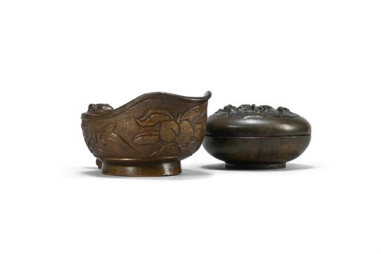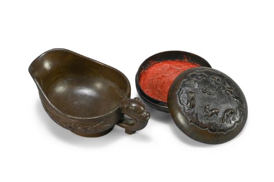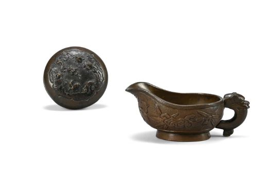 A Chinese bronze seal paste box and cover, 17th or 18th century, the base inscribed with an apocryphal xuande mark, 6cm diameter, weight 160.5 grams; and a Chinese bronze libation cup, 17th or 18th century, 4cm high × 9.8cm wide, weight 83 grams (2)清十九/十八世纪 铜印泥盒以及铜爵杯 Condition Report: both with minor knocks and wear commensurate with age Condition Report Disclaimer