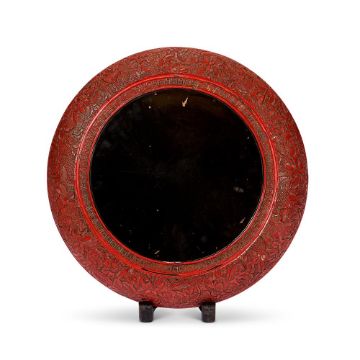 A Chinese circular cinnabar lacquer dish, Qing dynasty, carved in the 16th century style, with scholars and attendants seated in a bamboo grove, within wide floral border, the reverse similarly decorated with a wide floral band 35.7cm diameterProvenance: William Alexander Palmer, 1925-2020. 清 剔紅人物圖圓盤拍品來源:英國帕瑪家族William Alexander Palmer收藏 Condition Report: some wear and minor losses mainly to black lacquer base Condition Report Disclaimer