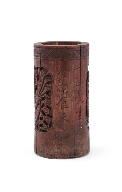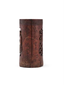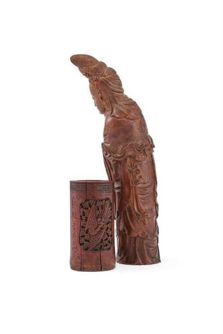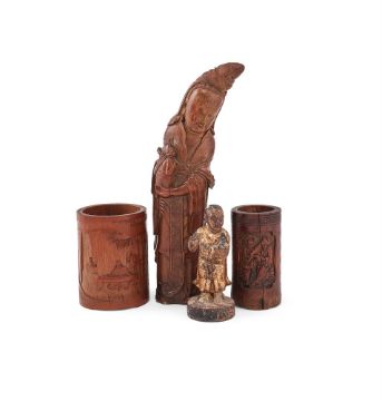 A group of Chinese bamboo carved items, Qing Dynasty, comprising two carved bamboo brush pots, approximately 12.6cm high each; a carved bamboo figure of Ma Gu, 31.6cm high; and a carved wood gilt sculpture of a boy, 14.5cm high (4)Please note this lot is to be offered without reserve.清 竹雕筆筒等一組四件  Condition Report: The two brush pots with cracks and the gilt figure of the boy with losses and damage Condition Report Disclaimer