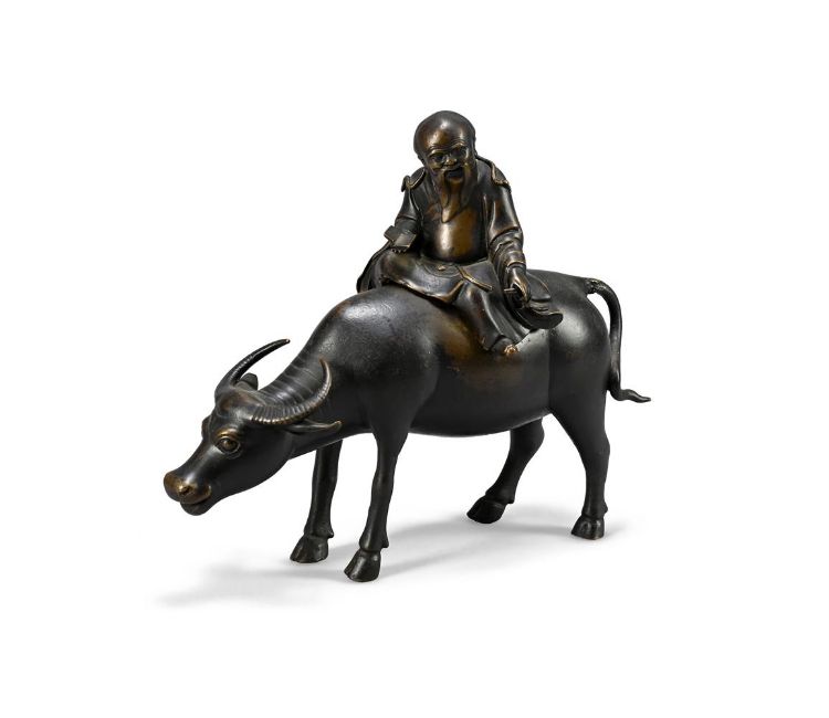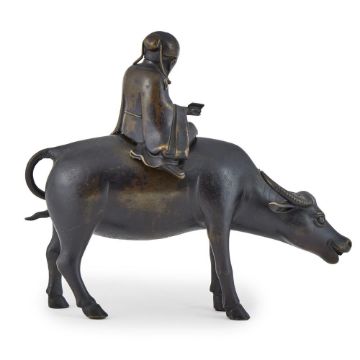 A Chinese bronze model of Laozi and buffalo, 19th century, 23cm high, 28cm long清十九世紀 銅老子騎牛 Condition Report: minor wear to the surfaceCondition Report Disclaimer