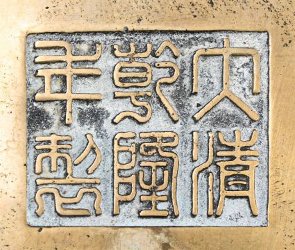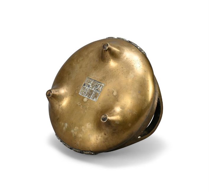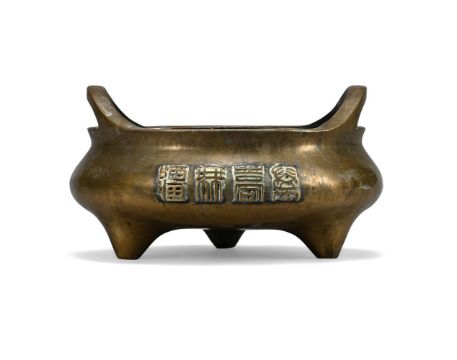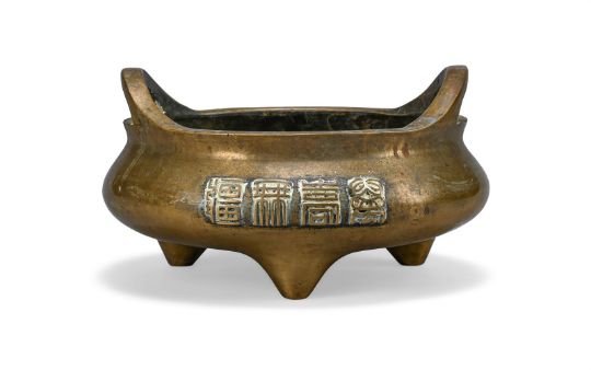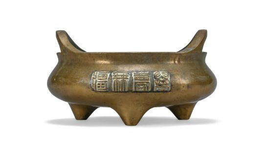 A Chinese bronze two-handled censer, Qing dynasty, of bombé shape, each side cast with four characters reading as wanshouwujiang, apocryphal six-character Qianlong mark on the recessed base, 24.5cm wide × 14cm high, weight 4194 grams清 乾隆款銅衝耳爐(克重4194g) Condition Report: polishing to surface and with white encrustations from the polishing compound around the calligraphy and under handles and some water marks and corrosion Condition Report Disclaimer