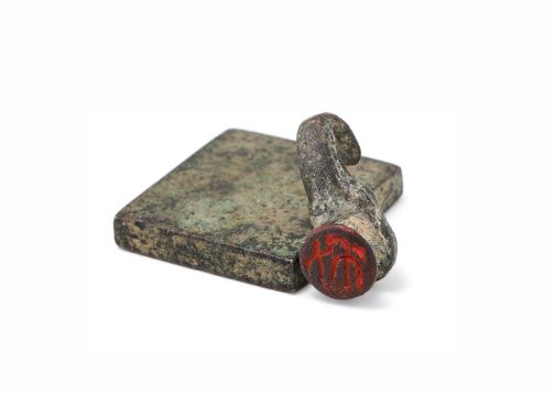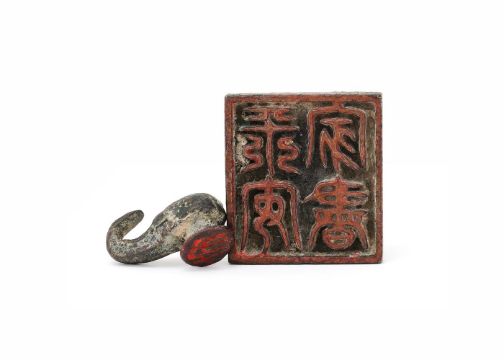 A Chinese bronze elephant-headed garment hook, Eastern Zhou Dynasty, circa 3rd century BC., 3.8cm long and a Chinese bronze square seal, Song or Ming dynasty, 4.2cm wide (2) Provenance: Collected by the current owner on the UK market in the 1980's or early 1990's Please note this lot is to be offered without reserve.東周 青銅衣鉤及宋/明 銅印拍品來源:英國紳士私人收藏,購自上世紀八十至九十年代  Condition Report: some corrosion to both Condition Report Disclaimer