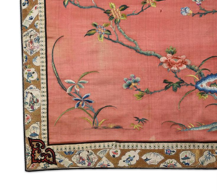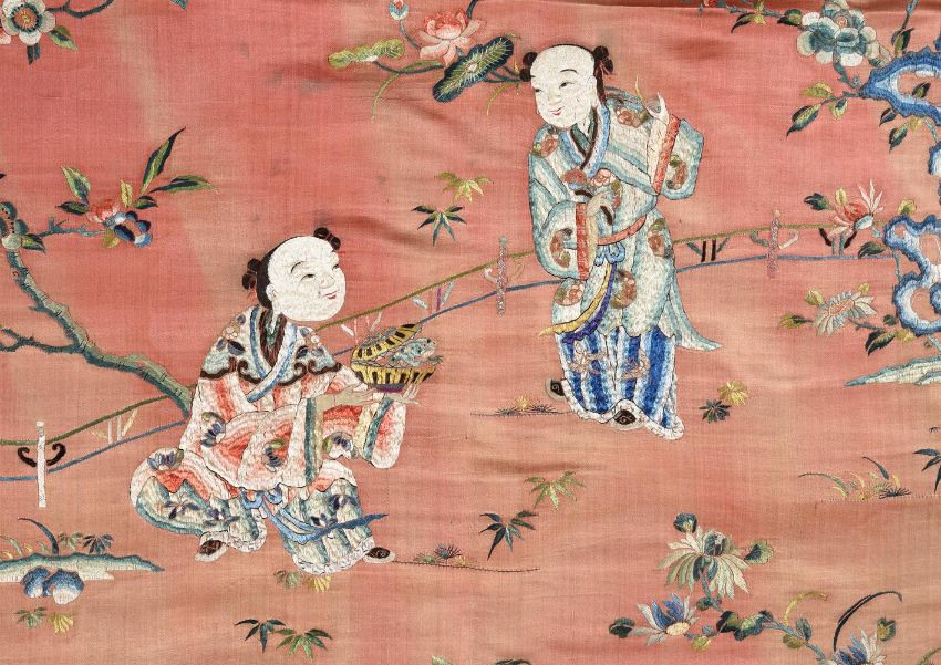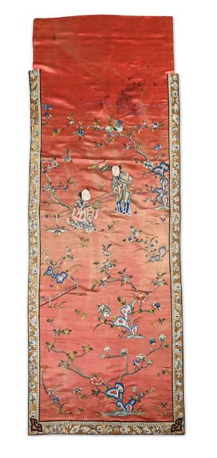 A Chinese silk 'Hundred Boys' wall hanging, Qing dynasty, mid 19th century, one boy offering a three legged toad signifying abundance of wealth, surrounded by a flowering tree, pomegranates and rocky outcrops, bordered with gold thread reserved with leaf and fan shaped panels, overall size 200cm x 79cm Please note this lot is to be offered without reserve.Provenance: By Family descentMme Marie Violet who was a private collector circa 1890-1915 清 紅地緞繡"百子呈祥"掛屏拍品來源:瑪麗·維奧萊特 (Marie Violet) 女士家族傳承,入藏於1890年至1915年期間 Condition Report: faded red silk and stained Condition Report Disclaimer