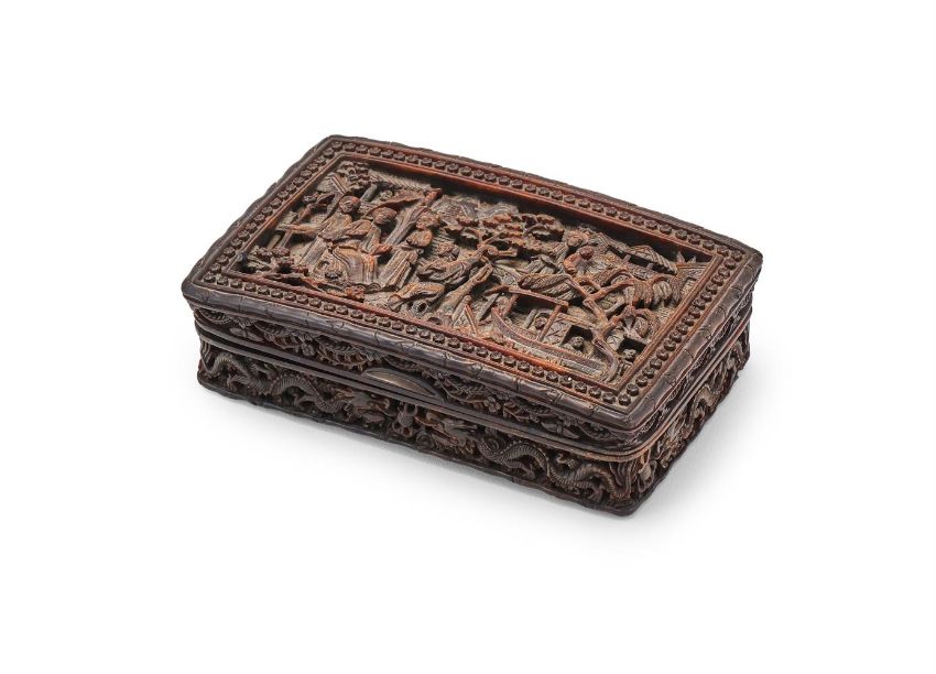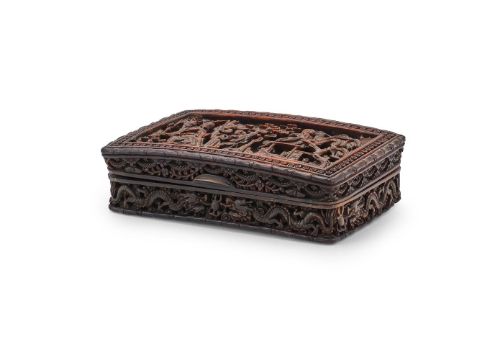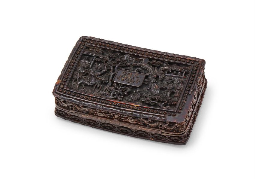Y A Chinese carved 'figural' tortoiseshell box and cover, Qing dynasty, 19th century, of slightly curved form, the inner lid inscribed, 'To Richard Entwisle Esqre., Rushhulme as a token of regard from his affectionate and obliged friend Henry Wynne Pool', the base with raised inscribed tablet with 'RE' initials and Latin motto, 11cm wide x 6.8cm deep x 3cm high 清十九世紀 玳瑁雕人物紋圓蓋盒 Condition Report: the underside with chips to two edges Condition Report Disclaimer