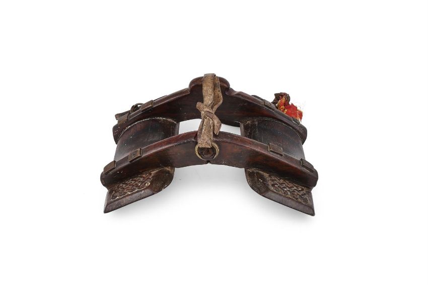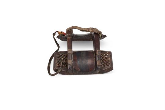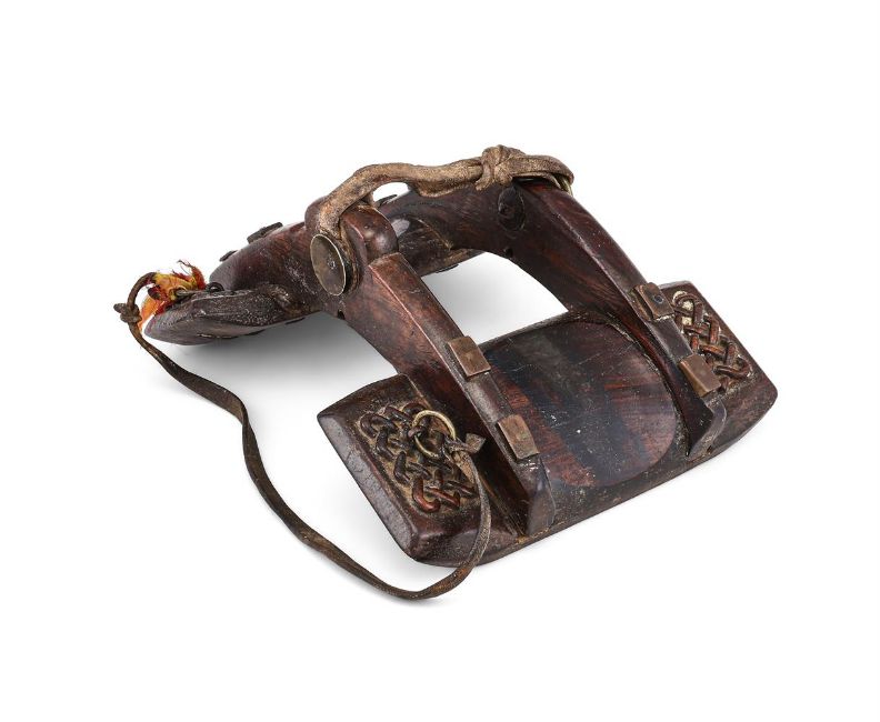 A Chinese or Japanese hongmu horse saddle, 19th century, attached with leather strips, 35cm long x 26cm wide清十九世紀 紅木馬鞍 Condition Report: wear and split to woodCondition Report Disclaimer