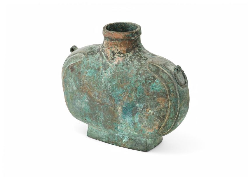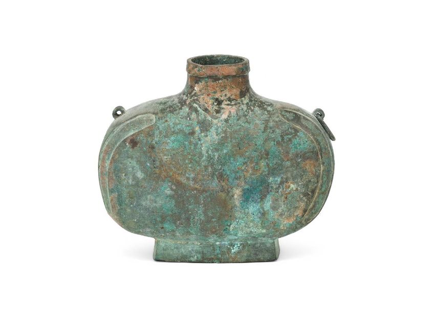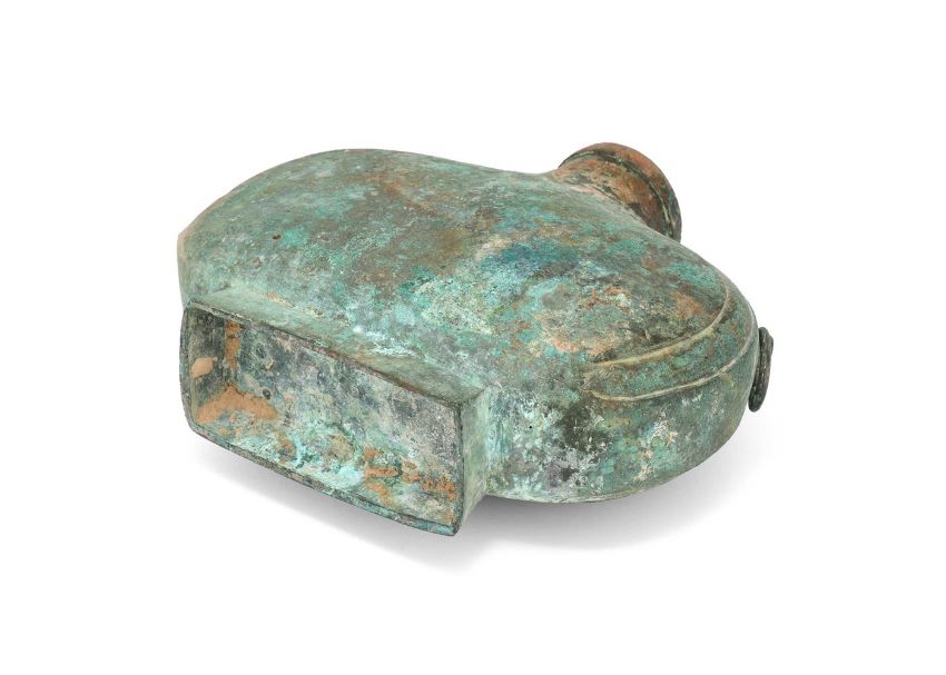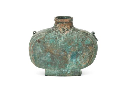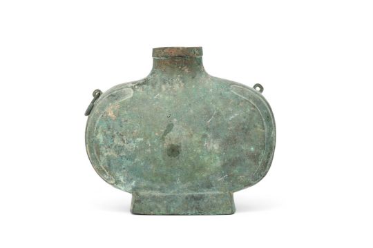A Chinese heavily cast bronze wine vessel, bianhu, Han dynasty (206 BC- AD 220), the flattened oval body is raised on a spreading rectangular foot, and the curve of the sides is accentuated by shallow, recessed panels that flank the handles, mottled pale olive-brown and milky green encrustation, 26cm high x 31cm maximum width, 5473 gramsProvenance: Collected by the current owner on the UK market in the 1980's or early 1990's Please note this lot is to be offered without reserve.漢 青銅扁壺拍品來源:英國紳士私人收藏,購自上世紀八十至九十年代   Condition Report: one ring handle missing corrosion and Verdigris some old small knocks  Condition Report Disclaimer