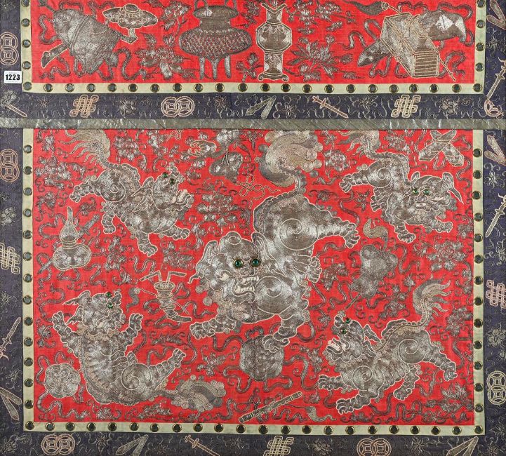 A Chinese red silk table frontal with matching pelmet used in the Pekin Opera, Qing dynasty, circa 1900, embroidered with gold thread and mirrored glass sequins, decorated with playful Buddhist lions, embellished with green glass eyes, 80cm x 88cm, framed 清 紅地京劇獅子圖桌圍  Condition Report: unexamined out of frame Condition Report Disclaimer