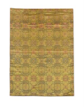 A good Chinese silk brocade in Imperial yellow, Qianlong, with octagon and other medallions, clouds and floral arrangements overlaid on a lattice ground, 92cm x 71cm The pattern often used in the Palace for wrapping books or precious objects. 清乾隆 锦地花卉黃緞 Condition Report: in very good condition with very slight fading with selvage to two sides making it a complete widthlater cotton lining Condition Report Disclaimer