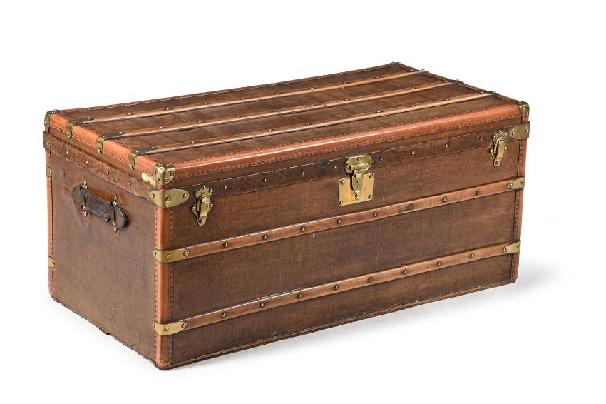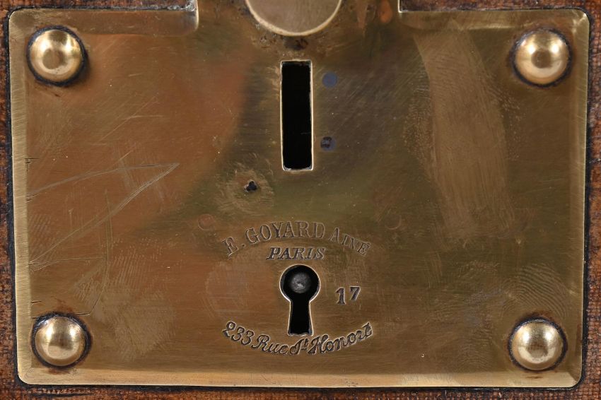 A GOYARD CANVAS, WOOD, LEATHER AND BRASS MOUNTED TRUNK LATE 19TH OR EARLY 20TH CENTURY A plaque printed to the side of the hinged top 'MALLES GOYARD 233 Rue Saint Honore PARIS MONTE CARLO-BIARRITZ', the base double branded 'MALLES GOYARD 233 RUE ST-HONORE. PARIS', the brass side catches stamped 'GOYARD AINE', the brass lock engraved 'E GOYARD AINE PARIS - 17 - 233 Rue St Honore', the interior calico and linen lined 50cm high, 111cm wide, 56cm deep'Malles' Goyard, refers to the french term 'malletiers' which translates as trunk, suitcase and luggage makers. Goyard, was founded in Paris as Maison Martin in 1792, before becoming Maison Morel and finally Maison Goyard in the 1850s. In 1885 the house changed its name to E Goyard Aîné.