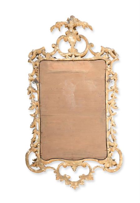 A GEORGE III CARVED GILTWOOD MIRROR CIRCA 1780 Flower spray surmount, pierced scroll and foliate surround 112cm high, 52cm wideProvenance: The Estate of a deceased Gentleman Condition Report: Marks, knocks, scratches and abrasions commensurate with age and use Some old chips, splits, losses and minor splits The gilding has been later refreshed at some point - some areas of the underlying bole revealed in places The mirror plate is a later replacement Previous holes to the back from old hanging fixtures Please see all additional images as a visual reference to condition.Condition Report Disclaimer