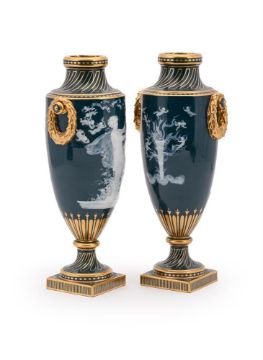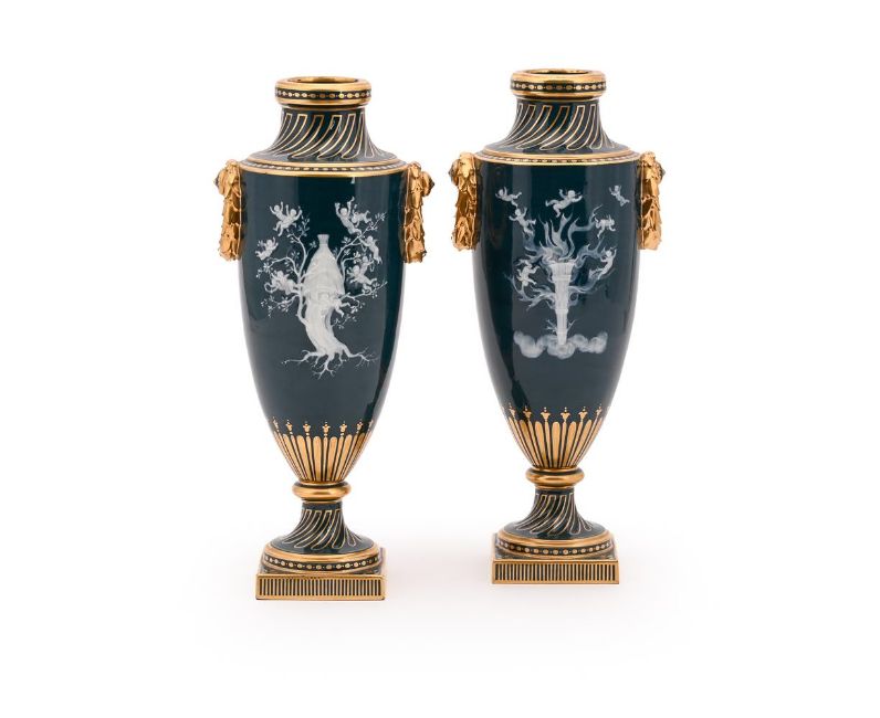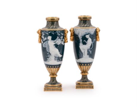 A PAIR OF MINTON PÂTE SUR PÂTE TWO HANDLED VASES BY ALBOIN BIRKS, EARLY 20TH CENTURY Carved in low relief with scenes after designs by Louis-Marc Solon, classical maidens, one emblematic of music with a tambourine, the other with brazier, reverses with beehive and flaming torch, blue ground with gilt floral detailing, signed A Birks, gilt globe marks and impressed MINTONS mark, shape number 2449, date mark 1910 30cm high Provenance: The Estate of a deceased Gentleman For a similar pair of vases decorated by Birks on the same body shape, see Sotheby's New York, Wedgwood and Beyond: English Ceramics from the Starr Collection, 23rd October 2019, Lot 228, ($35,000 incl. BP) and Christie's New York, Minton Pâte-Sur-Pâte Masterworks from a Distinguished Private Collection, 21st October 2008, Lot 24 (£18,750 incl. BP). Literature: See Bernard Bumpus, Pâte-sur-Pâte, The Art of Ceramic Relief Decoration, 1849-1992, London, 1992, p. 115 for a pair of plaques by Solon, titled 'Papillons' (butterflies) and 'Abeilles' (bees) the likely inspiration for designs. Condition Report: Probably missing covers. Slight wear to the gilding. Please see additional images available from the Dept. upon request. Please see additional images for visual references to condition which form part of this condition report. All lots are available for inspection and Condition Reports are available on request. However, all lots are of an age and type which means that they may not be in perfect condition and should be viewed by prospective bidders; please refer to Condition 6 of the Conditions of Business for Buyers. This is particularly true for garden related items. All lots are offered for sale "as viewed" and subject to the applicable Conditions of Business for Buyer's condition, which are set out in the sale catalogue and are available on request.  Condition Report Disclaimer
