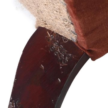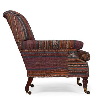 A MAHOGANY AND KILIM UPHOLSTERED 'WILLOUGHBY' ARMCHAIR BY HOWARD & SONS, LATE 19TH CENTURY One back leg stamped '18540 5853', all castors stamped 'HOWARD & SONS LTD LONDON' 94cm high, 76cm wide, 78cm deep Condition Report: Marks, knocks, scratches and abrasions commensurate with age and use. Some old chips, scratches and minor losses to the legs Of solid, stable structure overall with some very minor movement to joins The kilim upholstery in good, clean condition Dreweatts is unable to comment on the originality and condition of the frame and elements beneath the upholstery. Please see all additional images as a visual reference to condition. Condition Report Disclaimer