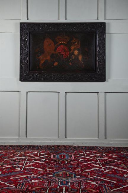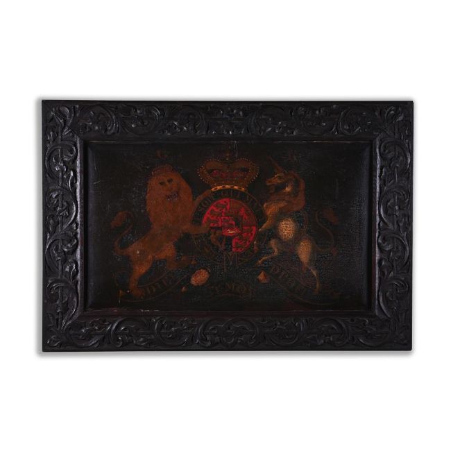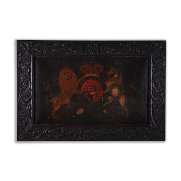 A LARGE PAINTED ROYAL COAT OF ARMS EARLY 19TH CENTURY Depicting the coat of arms of the United Kingdom circa 1816-1837 within a carved oak frame 89cm high, 131cm wide including the frame For a similar 18th century painted coat of arms, see Christie's London, Robert Kime, David Bedale, Piers von Westenholz and Christopher Gibbs - The English Home (5953), 30th April 2014, Lot 56 (£11,875 incl. BP).