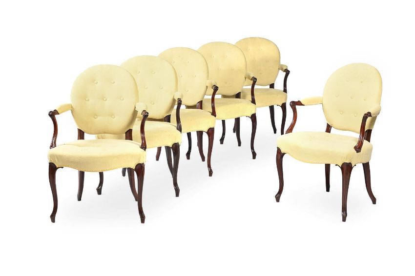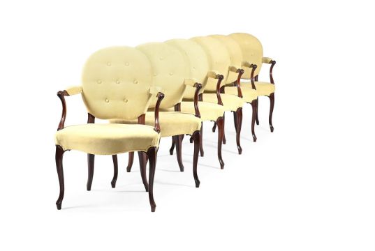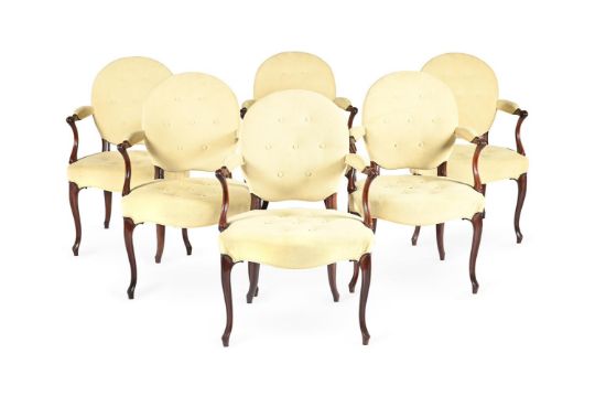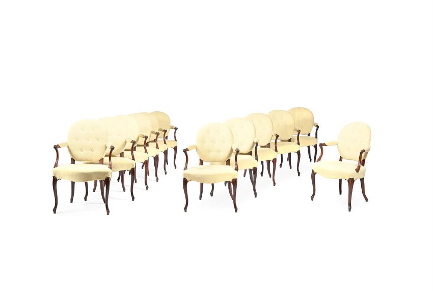 A SET OF TWELVE MAHOGANY AND UPHOLSTERED ARMCHAIRS IN GEORGE III STYLE, MID 19TH CENTURY 90cm high, 63cm wide, 50cm deep overall Provenance: Pelham Galleries, from the collection of Lord and Lady Marks, Sotheby's, February 1972 The Estate of a deceased Gentleman. A copy of the receipt will be made available to the successful purchaser.