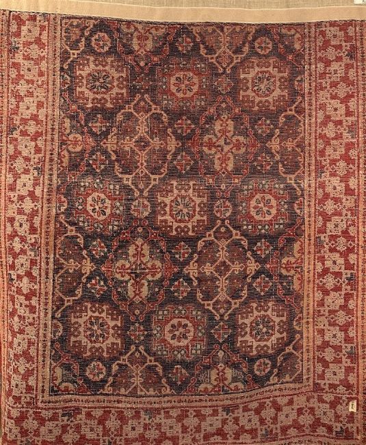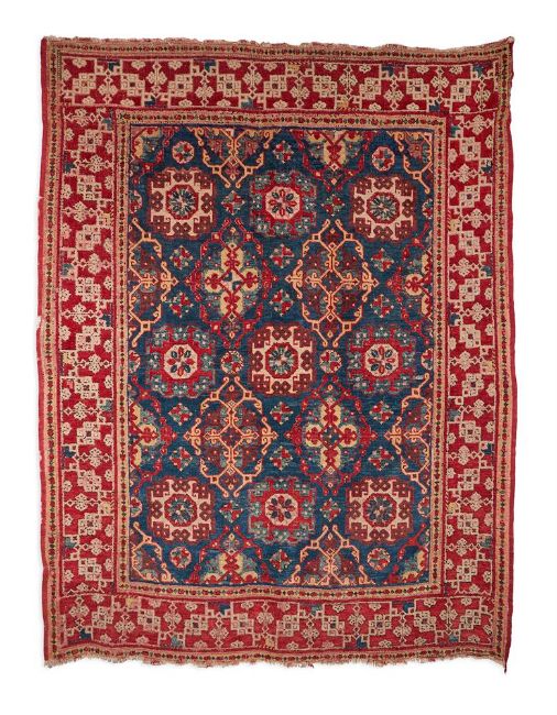 A TURKEY RUG OF 'SMALL-PATTERNED HOLBEIN' DESIGN approximately 175 x 135cm Provenance: The personal collection of the Late Robert Kime, LVO (1946-2022) This rug has been made to the design of a well known group of Ottoman rugs thought to date from the mid 15th until the mid 16th centuries. It is thought that these rugs were woven in western Anatolia, in the Ushak region. Most rugs from the group of the early period have a variant of a 'kufic' border design that is reminiscent of a type of stylised calligraphy that originated in the city of Kufa in the 7th century. However, this rug is different, and although the border has aspects in common with 'kufic' border designs, it unusual in its combination of design elements (for example the use of partial stellar motifs). The border is also uncharacteristically wide. The early group of rugs that the design of this piece is based upon derive their name from the painter Hans Holbein the Younger, as a rug of this design appears in his Portrait of George Gisze of 1532. However, early rugs of this design appear in the work of many European artists from the mid 15th until the 17th century, see: Mills, John 'Small Pattern Holbein' Carpets in Western Paintings, Hali, vol.1 no.4, 1978, pp 326-334. Among these are Piero della Francesca, Andrea Mantegna and Domenico Ghirlandaio. Perhaps most famously, an example of a rug of this type appears in a painting, artist unknown, that documents the Somerset Conference of 1604, a peace treaty to negotiate the end of the Anglo-Spanish war. This painting hangs in the National Portrait Gallery. Condition Report: Generally in good pile, and in largely original condition. A small number of small areas of re-piling and repair. Corrosion to charcoal wool, with darkest brown pile mostly lost. Lighter walnut brown also corroded, pile low but mostly extant. Selvages (side cords) not original, and missing in places. Uneven loss to both ends, with outer guard stripe partially lost The top has been backed with Hessian and velcro - this is to allow for hanging to a wallPlease see additional images for visual reference to condition Condition Report Disclaimer
