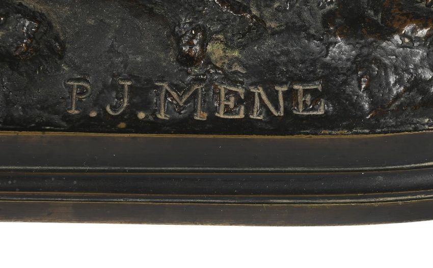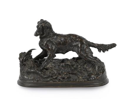 PIERRE-JULES MÊNE (FRENCH, 1810-1871), AN ANIMALIER BRONZE 'CHIEN ÉPAGNEUL' MID TO LATE 19TH CENTURY Depicting hunting dog, probably a setter, signed to cast 21.7cm high, the base 31.3cm wide, 14.2cm deep Provenance: South Audley Antiques, London, September 1990. The Estate of a deceased Gentleman. A copy of the receipt will be made available to the successful purchaser. Condition Report: With quite heavy wear to the patina from handling, use and age throughout. Some surface dirt and dust build up, notably to naturalistic base. Sits fairly flat and stable 21.7cm high, the base 31.3cm wide, 14.2cm deep Please see additional images for visual references to condition which form part of this condition report. All lots are available for inspection and Condition Reports are available on request. However, all lots are of an age and type which means that they may not be in perfect condition and should be viewed by prospective bidders; please refer to Condition 6 of the Conditions of Business for Buyers. This is particularly true for garden related items. All lots are offered for sale "as viewed" and subject to the applicable Conditions of Business for Buyer's condition, which are set out in the sale catalogue and are available on request. Condition Report Disclaimer