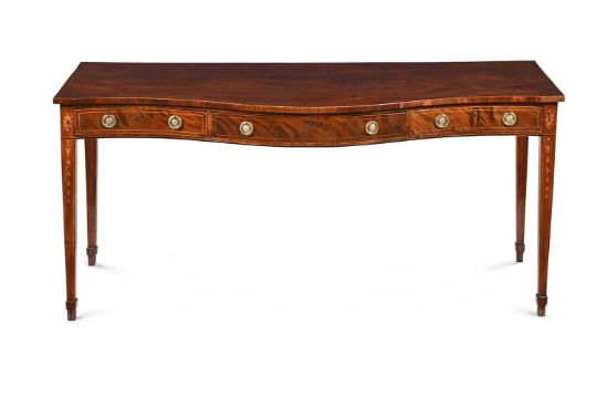 A GEORGE III MAHOGANY AND INLAID SERPENTINE FRONTED SERVING OR HALL TABLE CIRCA 1790 With three drawers to the frieze 91cm high, 192cm wide, 72cm deep Provenance: Patrick Sandberg Antiques, London, January 2010 The Estate of a deceased Gentleman. A copy of the receipt will be made available to the successful purchaser. Condition Report: Marks, knocks, scratches and abrasions commensurate with age and use.Chips, splits, losses, and repairs throughout. The top with various additional marks, scratches and a neat inset timber repair to disguise a split, running from the left side to the centre.The handles are of the period but are not original to the piece, there are plugged holes to the reverse of the drawer fronts. Some later fillets and batons of timber applied to the interior of the carcass. No key is present however all locks are open and operatable.Some minor lifting/warping to the top. Please see additional images.  Condition Report Disclaimer