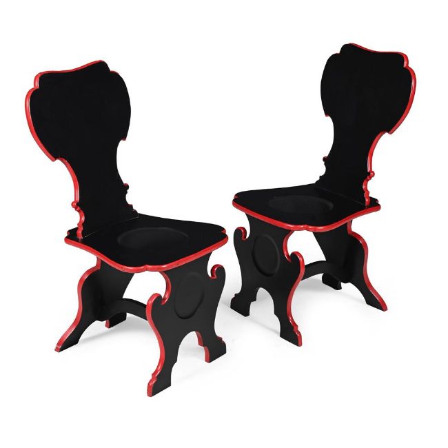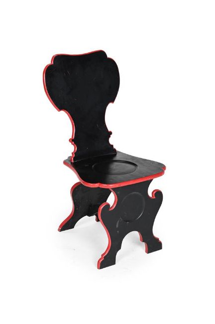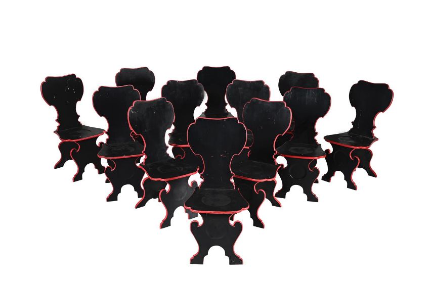 A SET OF TWELVE BLACK AND RED PAINTED SCABELLO HALL CHAIRS BY JOHN IVES, IN GEORGE III STYLE, LATE 20TH CENTURY 98cm high, 48cm wide, 49cm deepJohn Ives is the chief cabinet maker at the Houghton Hall Estate workshop, Norfolk