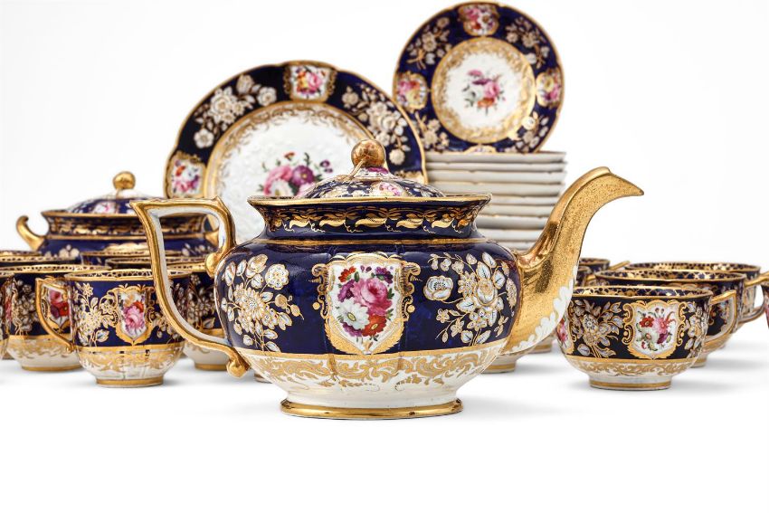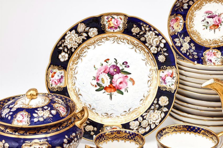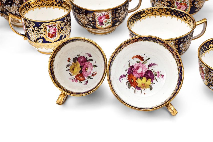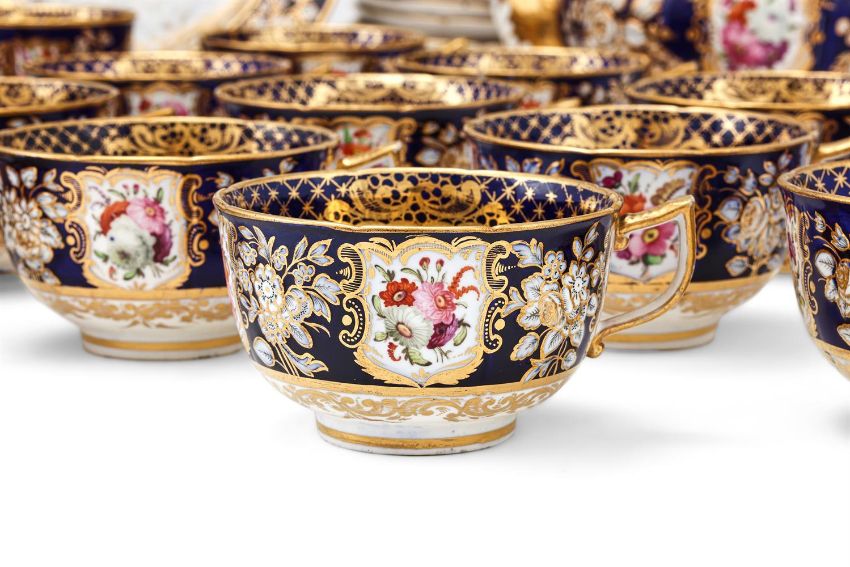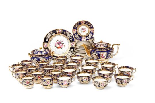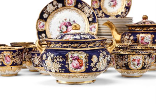 A COALPORT (JOHN ROSE) PORCELAIN 'NEW EMBOSSED' BLUE-GROUND AND GILT PART TEA SERVICE CIRCA 1825 Painted with a version of pattern 988 with panels of flowers and moulded in relief with flowers, comprising: a round teapot and cover, a round sugar-box and cover; a sandwich plate; twelve teacups; twelve coffee cups and fourteen saucersProvenance: Lawrences, Crewkerne, 19th July 2019, Lot 261, (£2,100 excl. BP) Cf. Michael Messenger, COALPORT 1795-1926 (1995), p. 169 & 170, plates 116 & 117 and Michael Berthoud, AN ANTHOLOGY OF BRITISH CUPS (1982), p. 78, pl's 467 & 468. Condition Report: No obvious damage detected.Condition Report Disclaimer