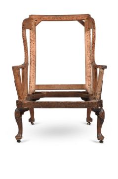 A GEORGE I WALNUT WING ARMCHAIR FRAME CIRCA 1720 109cm high, 84cm wide, 89cm deep Condition Report: Overall there scratches, marks, chips, scuffing, cracks and abrasions consistent with age and use.There is evidence of old worm.There are some losses and restorations: the legs have worn dark staining; some later elements including seat rail corner blocks and corner braces to the back, re-tipping to one arm and some ears replaced; metal braces to the arm supports; the frames show evidence of multiple upholstery tacks; the casters are of age but probably later.There is some small movement to the sides of the chair frame.Please see all the additional condition report photographs through the link on the condition report email as a visual reference of condition - they are a vital part of this report. Condition Report Disclaimer