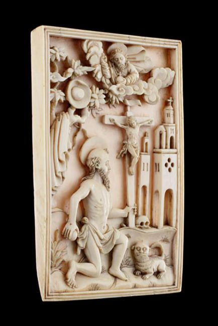 Y  A FINE AND RARE PORTUGUESE MACAO CARVED IVORY DEVOTIONAL PLAQUE PORTUGUESE MACAO, MID 17TH CENTURY Depicting St Jerome kneeling before Christ crucified, gripping the cross in one hand holding a stone in the other symbolic of his asceticism, his hands and feet with the stigmata- a sign of his passionate Christian devotion, his cardinal's hat and robe hanging in the tree, God the Father in the clouds above a lion at the Saint's Feet above him two medieval church towers, the scene probably based on a European engraving, modern stand plaque 12cm high, 8.5cm wide, 1cm deep Provenance: Ex Private collection of the Berkeley Family, Spetchley Park, Worcestershire, catalogued in a 1949 inventory as 'A Carved Panel (4¾' x 3½") of St Jerome Kept in the Strong Room'. In 374 A.D St Jerome became seriously ill in Antioch and two of his travelling companions died. In this state he dreamt that he appeared before God's judgement seat and was condemned for being a Ciceronian rather than a Christian. He took this experience very seriously and became a hermit in the desert of Chalcis in Syria for five years. He gave up the Classics he knew and loved and learnt Hebrew in order to study scripture. Proficient in both Greek and Hebrew, he went on to complete the enormous task of producing a standard Latin text of the Bible which he revised according to the meaning of the original texts. He then began to translate the Gospels and the Psalter and over time produced all, or nearly all, of the Bible in what became known as the 'Vulgate' version. A passionate and devoted Catholic scholar, St Jerome had a difficult temperament and a sarcastic wit, but it has been said of him that his immense learning was unmatched by any other Christian writer except St Augustine. cf: Asian Civilisations Museum Singapore for a similar Jesuit plaque depicting St Jerome painted in bright polychrome (no. 2011 - 01507) IVORY ACT 2018: A certificate for a pre-1918 item of outstandingly high artistic, cultural or historical value. Certificate number: URR59K10, date: 01/06/2023 Condition Report: Υ CITES REGULATIONS Please note that lots marked with the symbol (Υ) in the printed catalogue and the online catalogue may be subject to CITES Regulations when exported. Relevant CITES Regulations information may be found here. The refusal of any CITES licence or permit and any delay in obtaining such licences or permits shall not give rise to the rescission or cancellation of any Sale, nor allow any delay in making full payment for the Lot. With wear, marks, knocks and scratches as per age, handling, use, and cleaning. Natural shrinkage faults mostly visible as darker lines notably to upper frame edge, some wear and small losses notably to Christ's right hand, upper fronds of foliage lower left etc. IVORY ACT 2018: A certificate for a pre-1918 item of outstandingly high artistic, cultural or historical value. Certificate number: URR59K10, date: 01/06/2023 Please see additional images for visual references to condition which form part of this condition report. All lots are available for inspection and Condition Reports are available on request. However, all lots are of an age and type which means that they may not be in perfect condition and should be viewed by prospective bidders; please refer to Condition 6 of the Conditions of Business for Buyers. This is particularly true for garden related items. All lots are offered for sale "as viewed" and subject to the applicable Conditions of Business for Buyer's condition, which are set out in the sale catalogue and are available on request. Condition Report Disclaimer