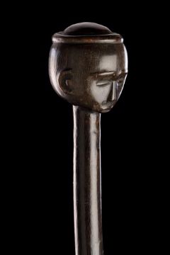 Y  A RARE SOUTH AFRICAN BLACK RHINOCEROS HORN PRESTIGE STAFF OR SCEPTRE TSONGA/NORTH NGUNI, MID 19TH CENTURY Finely carved with the head of a chief, with short haft drilled for a wrist thong, smooth old silky burnished patina lacking at the base where it has been held and used, modern stand 39.5cm long, 43.5cm high with base Provenance: Ex English Private collection Acquired late 1980's Literature: Art of South East Africa 2002, K. Conru no.104, pipe bowl very similar in the style and mimicking the carved head-ring of the rhinoceros horn sceptre Among the Tsonga speaking groups living to the North of Kwa Zulu-Natal, Chiefs commissioned long staffs surmounted by male heads with head-rings. These are formed from circular tubes made from a gum-like substance that are sewn into the hair. Head-rings were first adopted in the Zulu Kingdom as a sign of marriage. Tsonga speakers associated their use more generally with the concept of wisdom, age and maturity. In the early 19th Century all the best specialist craftsmen were most probably attached to the Royal Court and the objects they produced were more elaborately carved and decorated than those made for the ordinary homesteads. Even as late as the 1880's objects were being made for important officials in the long established figurative tradition, but this period saw a great deal of mobility in the entire region and carvers localised in one area became influenced by other works as populations migrated. Immediately recognisable as South African, the extremely delicate carved facial features of this sceptre are comparable to the best 'baboon master' staffs. However, the carver who produced this exceptional chiefly prestige item, although firmly in the Nguni traditional style, was probably working at an earlier date. The especially sensitive treatment of the head and face betray the hand of a master. Ubuntu Exhibition, 2002, Paris, Musée National des Arts d'Afrique et d'Océanie, no. 38, head of a staff, exhibits very similar features and is ascribed to the Tsonga, North Nguni Johannesburg Art Gallery, Brenthurst Collection Catalogue, no. 299, a combined headrest walking staff has the same compact treatment of form of the ovoid head Condition Report: The weight of this item is 347g Υ CITES REGULATIONS Please note that lots marked with the symbol (Υ) in the printed catalogue and the online catalogue may be subject to CITES Regulations when exported. Relevant CITES Regulations information may be found here. The refusal of any CITES licence or permit and any delay in obtaining such licences or permits shall not give rise to the rescission or cancellation of any sale, nor allow any delay in making full payment for the Lot. With wear, marks, knocks and scratches as per age, handling, use, and cleaning. Natural patina from handling and age and as per cataloguing, some natural shrinkage visible throughout, occasional darker marks and surface bruises from age and handling and slight ring beneath knop Please see additional images for visual references to condition which form part of this condition report. All lots are available for inspection and Condition Reports are available on request. However, all lots are of an age and type which means that they may not be in perfect condition and should be viewed by prospective bidders; please refer to Condition 6 of the Conditions of Business for Buyers. This is particularly true for garden related items. All lots are offered for sale "as viewed" and subject to the applicable Conditions of Business for Buyer's condition, which are set out in the sale catalogue and are available on request. Condition Report Disclaimer