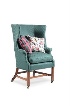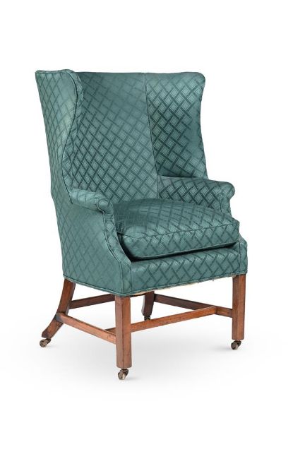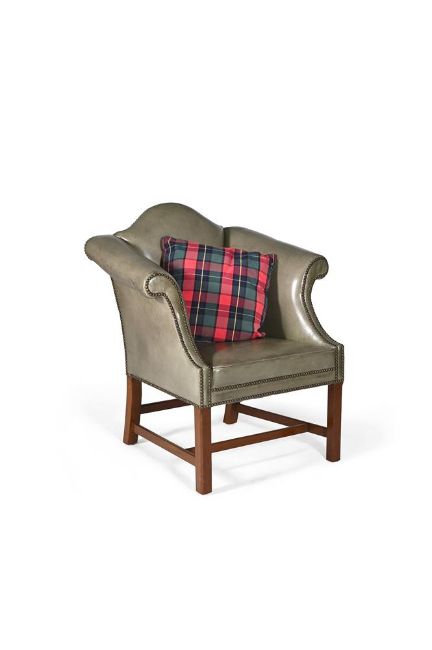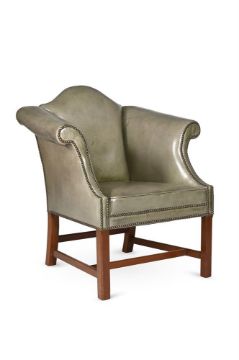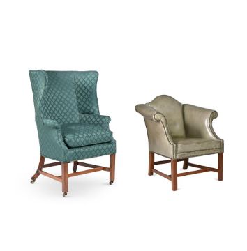 A GEORGE III MAHOGANY AND UPHOLSTERED WING ARMCHAIR CIRCA 1780 114cm high, 75cm wide, 59cm deep overall TOGETHER WITH a leather upholstered armchair, 20th century, 91cm high, 81cm wide, 62cm deep Provenance: The first- Hallidays, Wallingford, August 1993 The Estate of a deceased Gentleman. A copy of the receipt for the first item will be made available to the successful purchaser. Condition Report: Please note the below condition report is the only one available.Marks, knocks, scratches and abrasions commensurate with age and useSome old chips, splits, losses and repairs The leather upholstered chair: leather in good, clean condition - some minor marks and scratches, free from any holes or tears. Solid and stable overall The George III armchair: upholstery with some fading, but generally in good condition, free from any holes or tears. Some old repairs, one leg with a small spliced repair. Some movement to joins, but of stable structure overall. Would benefit from a re-tightening of joints. Dreweatts is unable to comment on the originality and condition of the frame beneath the upholstery.The above report is supported with additional images which can be sent via a link. Please 'Ask a Question' to request these images. For any further enquiries please contact the department directly. Condition Report Disclaimer