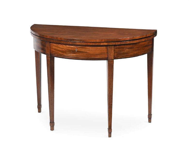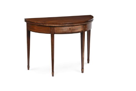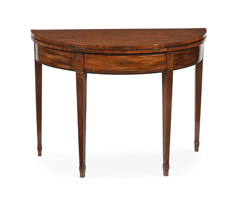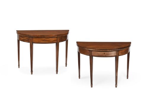 A PAIR OF GEORGE III MAHOGANY AND LINE INLAID DEMI-LUNE FOLDING TEA TABLES CIRCA 1800 each 70cm high, 99cm wide, 46cm deep (when closed) Provenance: Pelham Galleries, London, June 1975 The Estate of a deceased Gentleman A copy of the receipt will be made available to the successful purchaser. Condition Report: Please note the below condition report is the only one available.Marks, knocks, scratches and abrasions commensurate with age and useSome old chips, splits, losses and repairs. The underlying cross-stretchers to both tea tables have been replaced. Additional scratches, splits and repairs to the inner folds to both tables Evidence of old worm to the undersides of both tables Of solid, stable structure overall No key present, both frieze drawer locks open Some use of filler and grain filler to timber surfaces The above report is supported with additional images which can be sent via a link. Please 'Ask a Question' to request these images. For any further enquiries please contact the department directly. Condition Report Disclaimer