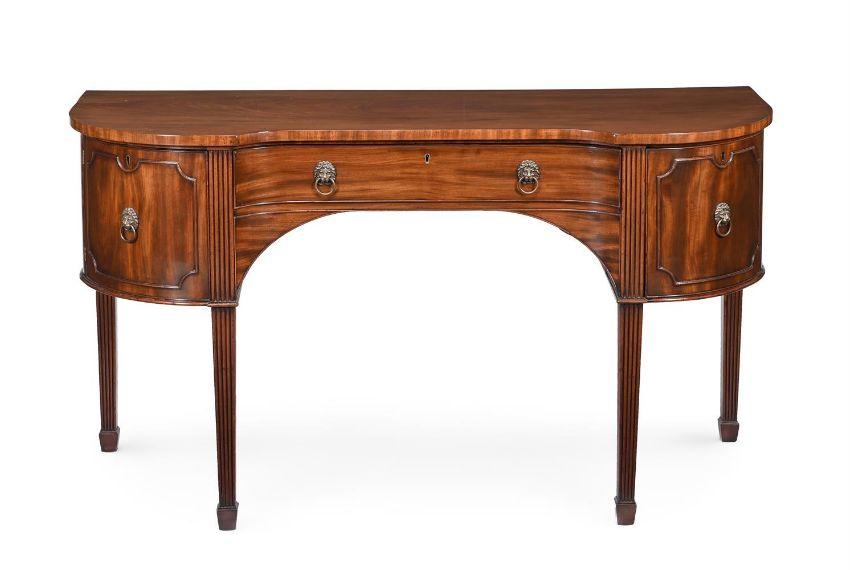 A LATE GEORGE III MAHOGANY SIDEBOARD CIRCA 1810 Of swept inverted breakfront form, with a frieze drawer flanked by a pair of panelled breakfront doors, on reeded tapered square legs with spade feet 89cm high, 162cm wide, 60.5cm deepProvenance: The Estate of a deceased Gentleman Condition Report: Please note the below condition report is the only one available.Marks, knocks, scratches and abrasions commensurate with age and useSome old minor chips, splits, losses and repairs Of cleaned appearance, some minor filler use and some minor fading Of solid, stable structure overall The above report is supported with additional images which can be sent via a link. Please 'Ask a Question' to request these images. For any further enquiries please contact the department directly. Condition Report Disclaimer