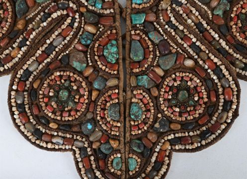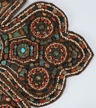 A CEREMONIAL HEADDRESS, COLLAR AND CUFFS 20TH CENTURY, TRANS HIMALAYAN REGION, PROBABLY LADAKH Set with turquoise, jasper, coral and other precious stonesHeaddress 21cm high, 20cm diameter Collar 84cm wide, 84cm long Cuffs 7cm high, 20cm long, 20cm wide Condition Report: Please note the below condition report is the only one available. Some loss to the beading, fraying in places and small holes Discolouration and dirt to the beading and fabric.The above report is supported with additional images which can be sent via a link. Please 'Ask a Question' to request these images. For any further enquiries please contact the department directly. Condition Report Disclaimer