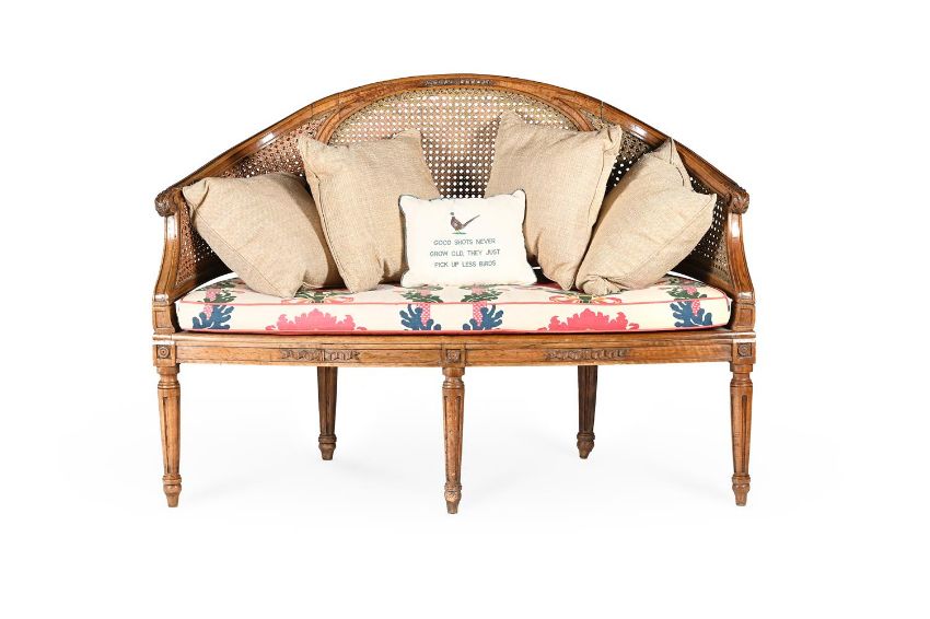 A FRENCH CANED CARVED BEECH SOFA 19TH CENTURY 97.5cm high, 144cm wide, 64cm deep Provenance: The Estate of a deceased Gentleman Condition Report: Please note the below condition report is the only one available. Marks, knocks, scratches and abrasions commensurate with age and useSome old splits and chipsEvidence of old worm in places throughout resulting in fragmentary losses in places - see images for extentSome opening to jointsCentral front leg is slightly loose but remains in positionSome moment within frameOne break to one rear side panel of caningLoose seat cushion with some minor wear and water marksSome supporting blocks of timber to underside of seatThe above report is supported with additional images which can be sent via a link. Please 'Ask a Question' to request these images. For any further enquiries please contact the department directly.Condition Report Disclaimer