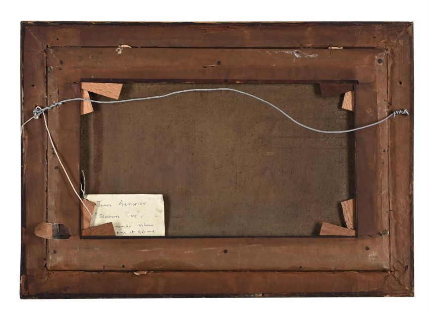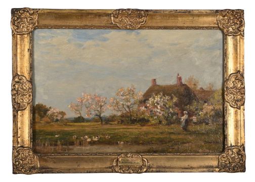 JAMES AUMONIER (BRITISH 1832-1911) A COTTAGE IN A SPRING LANDSCAPE Signed (lower right) 32 x 49cm (12½ x 19¼ in.) Measurements do not include the frame unless specified. Please note Dreweatts are not liable for damage to frames or mounts. Condition Report: The canvas presents a thick layer of dirt scattered across the whole surface. UV light reveals no evident signs of retouching. To conclude, a few dirt stains are scattered across. A superficial clean would definitely improve the painting. Condition Report Disclaimer