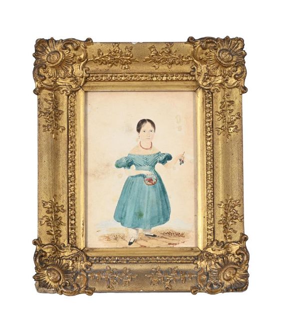 ENGLISH SCHOOL (LATE 19TH CENTURY) PORTRAIT OF A CHILD HOLDING CHERRIES AND A BASKET Watercolour 17 x 11.5cm (6½ x 4½ in.) This lot is from a deceased estate sold to benefit the Art Fund.Measurements do not include the frame unless specified. Please note Dreweatts are not liable for damage to frames or mounts.   Condition Report: Unexamined out glazed frame. The watercolour presents various dirt stains in the background, as well as a few yellowed stains on the dress and sleave. Condition Report Disclaimer