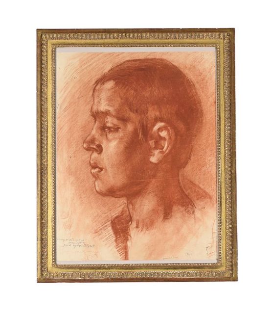 RUSSIAN SCHOOL (20TH CENTURY) HEAD STUDY Red chalk Variously inscribed 63 x 48cm (24¾ x 18¾ in.)Possibly a study executed during a workshop under the supervising professor Abugov. The sheet is inscribed with an 'excellent' remark to the right hand side which may have been the examiner's comments. Measurements do not include the frame unless specified. Please note Dreweatts are not liable for damage to frames or mounts.