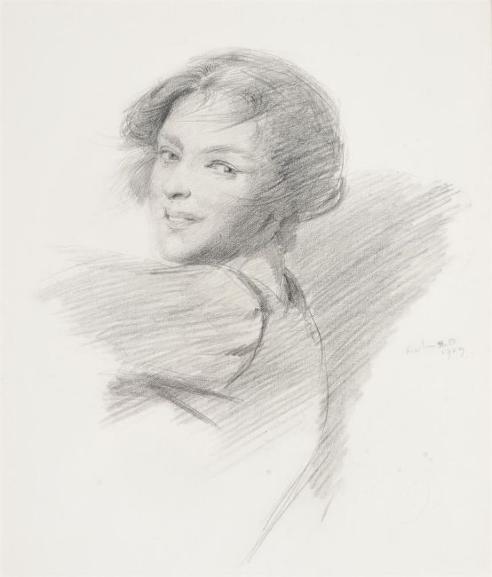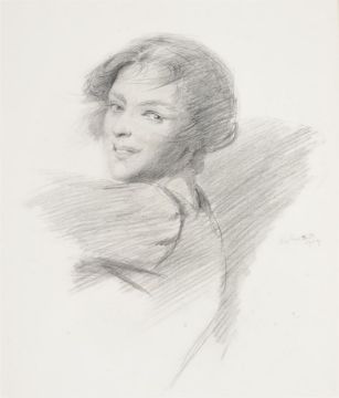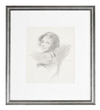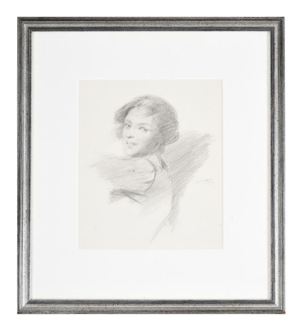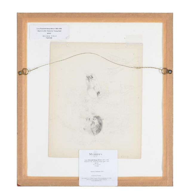 λ LUCY KEMP-WELCH (BRITISH 1869-1958) HEAD OF A YOUNG GIRL - STUDY FOR 'APRIL' Pencil, with a further study verso Indistinctly dated 20 1909 (lower right) and stamped with the Lucy Kemp Welch studio collection stamp 25.5 x 21cm (10 x 8¼ in.)Provenance: Messum's, London Acquired from the above by the late owner in 2010Exhibited: London, Messum's, Spring Exhibition, 2009 Measurements do not include the frame unless specified. Please note Dreweatts are not liable for damage to frames or mounts.