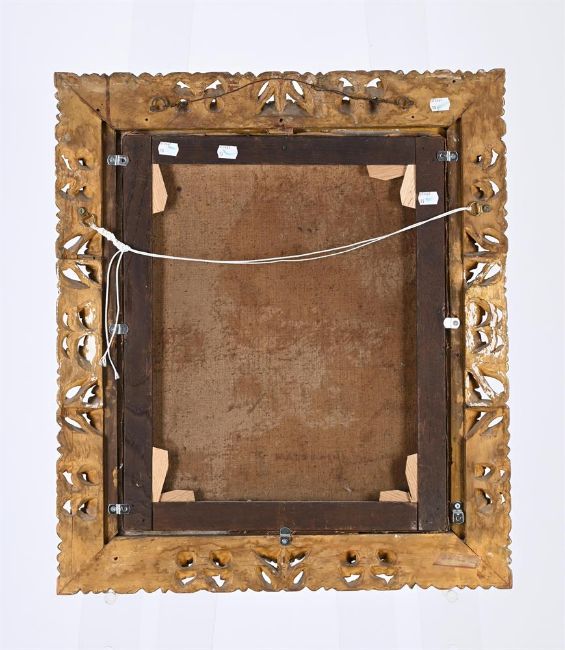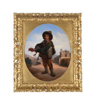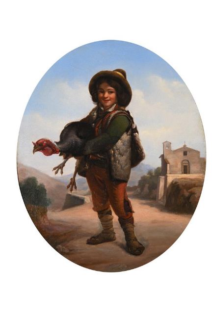 ATTRIBUTED TO GIUSEPPE MAZZOLINI (ITALIAN 1806-1876) BOY HOLDING A TURKEY Oil on canvas, oval 50 x 41cm (19½ x 16 in.)Provenance: Sale, Dreweatts, 30 June 2010, lot 233 Measurements do not include the frame unless specified. Please note Dreweatts are not liable for damage to frames or mounts. Condition Report: Stretcher mark visible to the upper edge. Light craquelure throughout. Some rubbing to the framing edges and some pin holes visible to the right edge. Condition Report Disclaimer