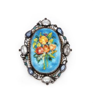 Enamel oval depicting a bouquet of coloured flowers on a blue ground, surrounded by wire openwork, inset with clear and blue faceted paste stones, signed to the reverse G.HUNT 1930