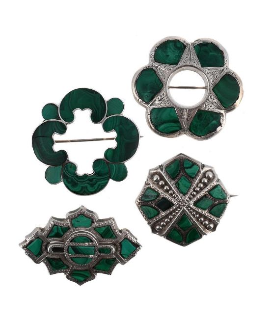 SCOTTISH INTEREST: FOUR VICTORIAN SILVER MALACHITE BROOCHES