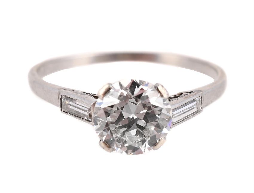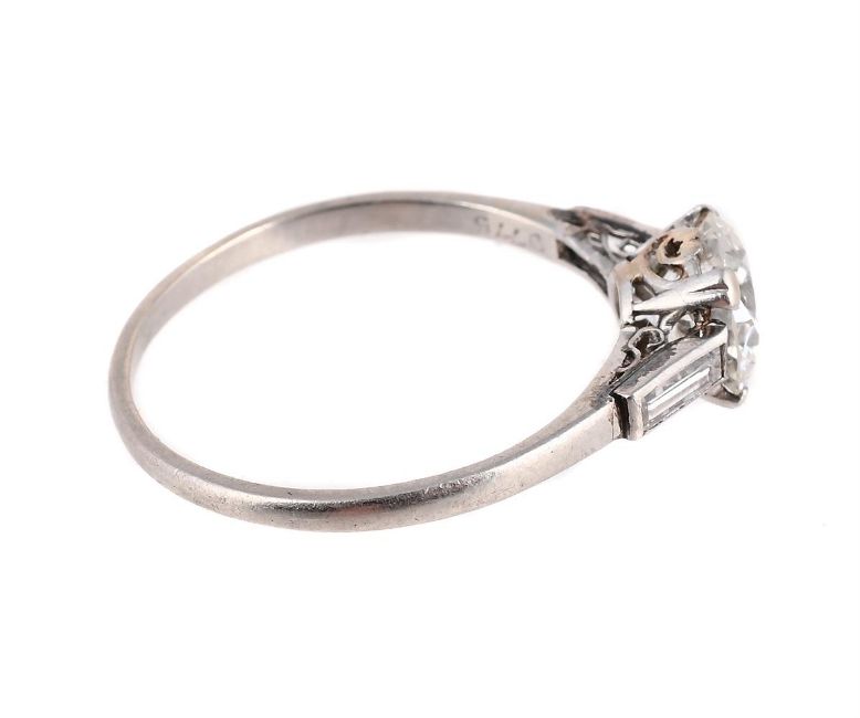 The old European cut diamond within four claw settings, estimated to weigh 1.00 carat, to baguette cut diamond shoulders, the shank numbered D775