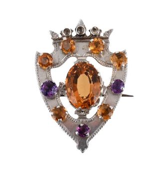 The shield shaped panel with a central oval cut citrine, within a border of circular cut citrines, amethyst and a purple paste, with crown surmount with whiter stone accents, registration mark dated 23 February 1866