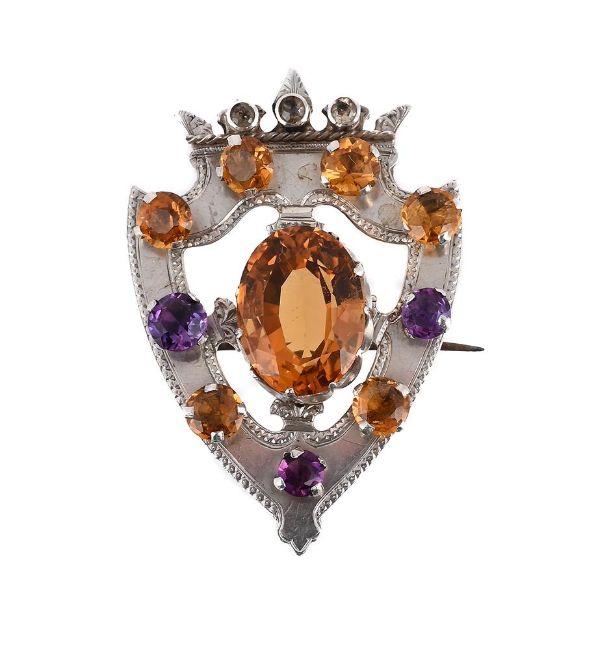 SCOTTISH INTEREST: A VICTORIAN SCOTTISH SILVER AMETHYST AND CITRINE SHIELD/LUCKENBOOTH BROOCH