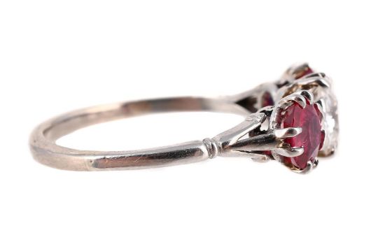 A DIAMOND AND SYNTHETIC RUBY THREE STONE RING