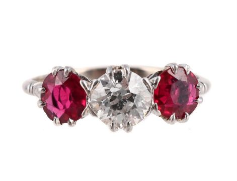 The old cut diamond between two circular cut synthetic rubies, diamond estimated to weigh 0.75 carats, to trifurcated shoulders, unmarked