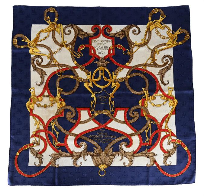 The cream and blue ground with blue border, with red, ochre and brown tone detail, signed Hermès, designed by Henri d'Origny, with decorative mounted horse twill, hand rolled and stitched edges
