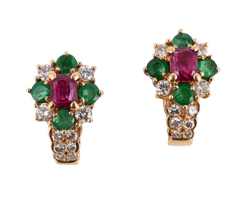 The earrings with a rectangular cut ruby, brilliant cut diamond and circular cut emerald cluster, to diamond set bases, with clip and stud fittings, stamped 750 18k